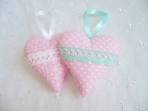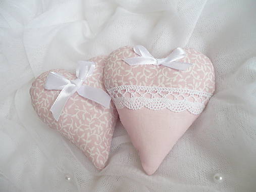 V pastelovej ružovej zdobené bavlnenou čipkou a saténovou šnúrkou.Do výplne je pridaná levanduľa ktorá srdiečka krásne rozvonia.Vyrobím v rôznom farebnom prevedení podľa vášho želania.Vhodné ako dekorácia,darčeky pre svadobčanov,menovky.