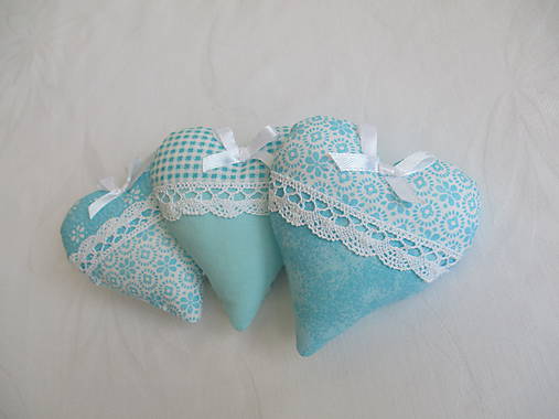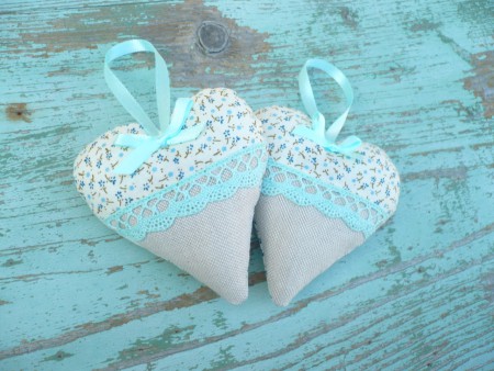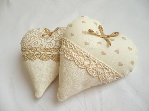 V jemných prírodných farbách,plnené polyesterovým vláknom v ktorom je pridaná levanduľa ktorá srdiečka krásne rozvonia.Zdobené bavlnenými krajkami v krémovej a ľanovej farbe, mašličkou z jutoviny(saténu).Spodná strana je vzorovaná.Vhodné ako darčeky pre svadobčanov,menovky, dekoráciu,alebo na akúkoľvek príležitosť.Vyrobím v akýchkoľvek farebných kombináciách podľa vášho želania.
