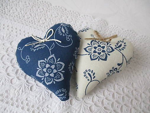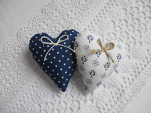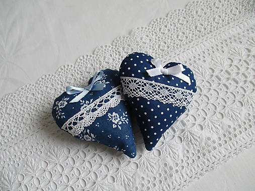 V krásnej modrobielej kombinácii zdobené bielou čipkou a saténovou mašľou.Plnené polyesterovým vláknom a levanduľou pre vôňu.Vhodné ako darčeky pre svadobčanov,dekorácie,menovky.Vyrobím v rôznom farebnom prevedení podľa vašich predstáv.Za príplatok zhotovým kartičky s poďakovaním menami,dátumom ,kartičky sú priviazané k srdiečku,info vnútornou poštou.