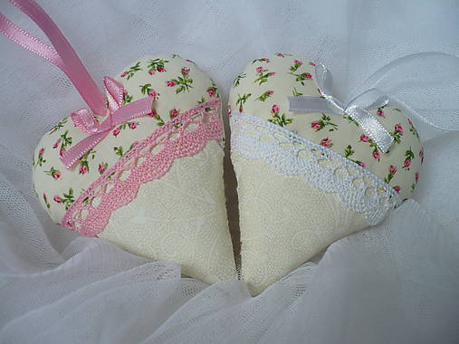 Z krásnych bavlnených látok v jemných vzoroch na krémovom podklade.Zdobené krajkou a stužkou bielou,ružovou podľa želania.Vyrobím aj v iných farebných prevedeniach podľa želenia.Vhodné ako darčeky pre svadobčanov,menovky na dekoráciu.Cena srdiečka s vyšitými iniciálmi je 1,20 .Vyrobím aj kartičku s menami,dátumom,poďakovaním za príplatok info vnútornou poštou.Do výplne je pre vôňu pridaná levanduľa.