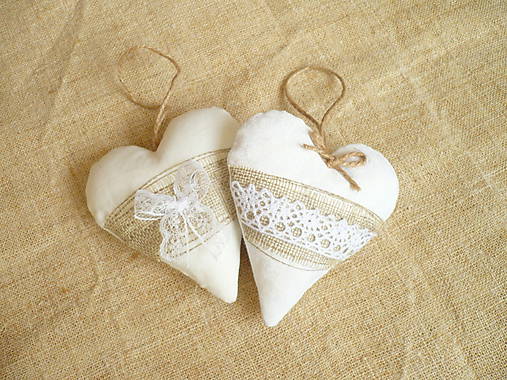 V krémovej farbe zdobené jutovinou a bielou mašľou zo syntetickej čipky.Srdiečko v pravo je z bielej bavlnenej látky zdobené jutovinou a bavlnenou čipkou.Do výplne je pridaná aj levanduľa,aby srdiečka krásne voňali.Vyrobím v rôznom prevedení. Na dekoráciu svadobného stola,alebo ako darčeky pre svadobčanov,menovky. Cena je za kus.Za príplatok vyrobím kartičku s menami,dátumom a pod.kartička je uviazaná na srdiečku.