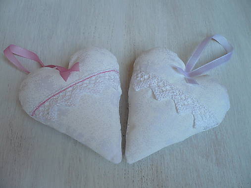 Srdiečka zhotovené z krásnej bielokrémovej bavlnenej látky plnené polyesterovým vláknom.Zdobené bielou,krémovou krajkou,ktorá môže byť prešitá farebnou niťou.Stužka na zavesenie je biela,krémová ružová,alebo inej farby podľa želania.Vhodné ako dekorácie,alebo darčeky pre svadobčanov,vyrobím aj v iných farebných kombináciách podľa želania..Na želanie pridám aj levandulu. Možná množstvená zľava.